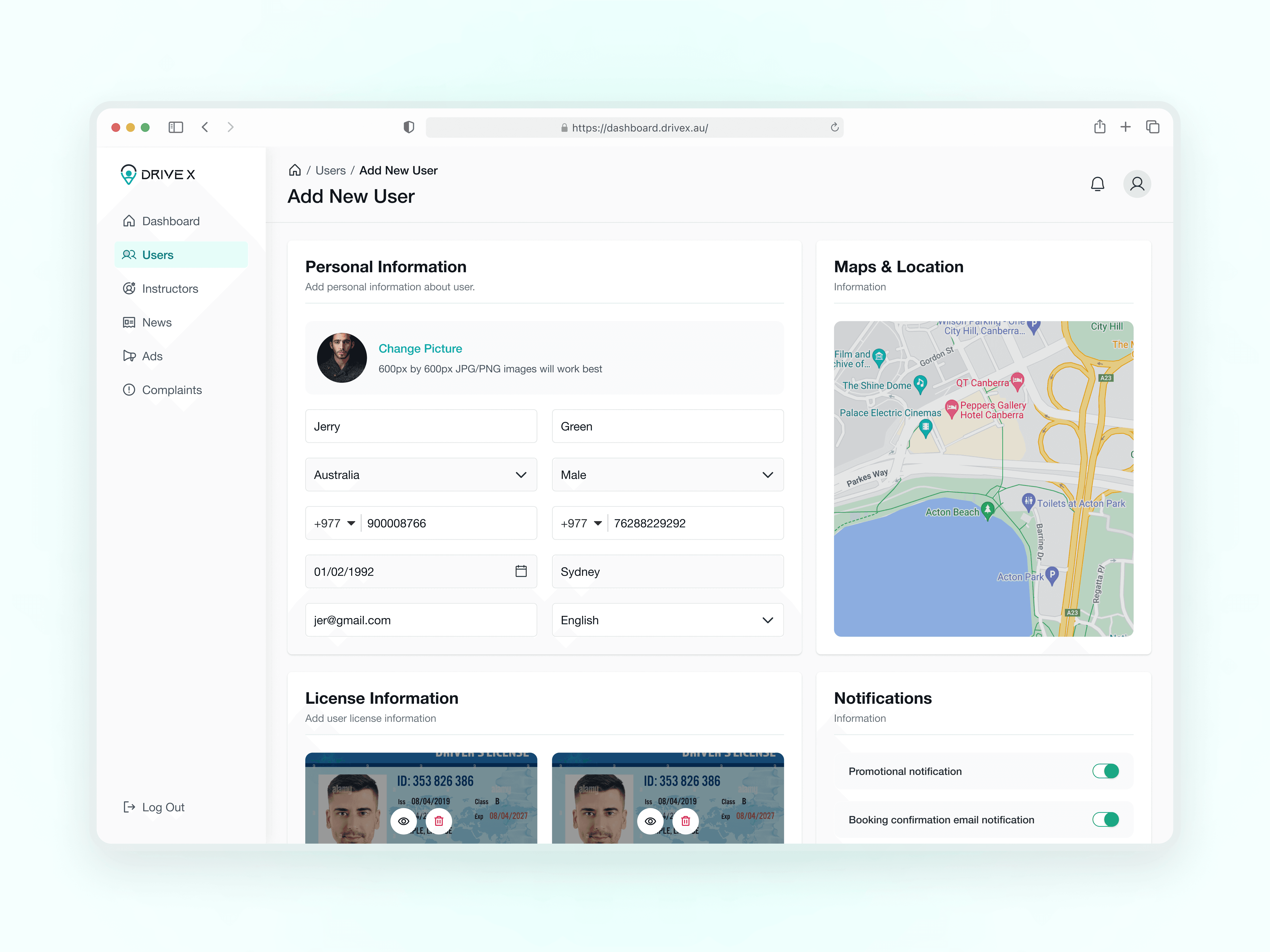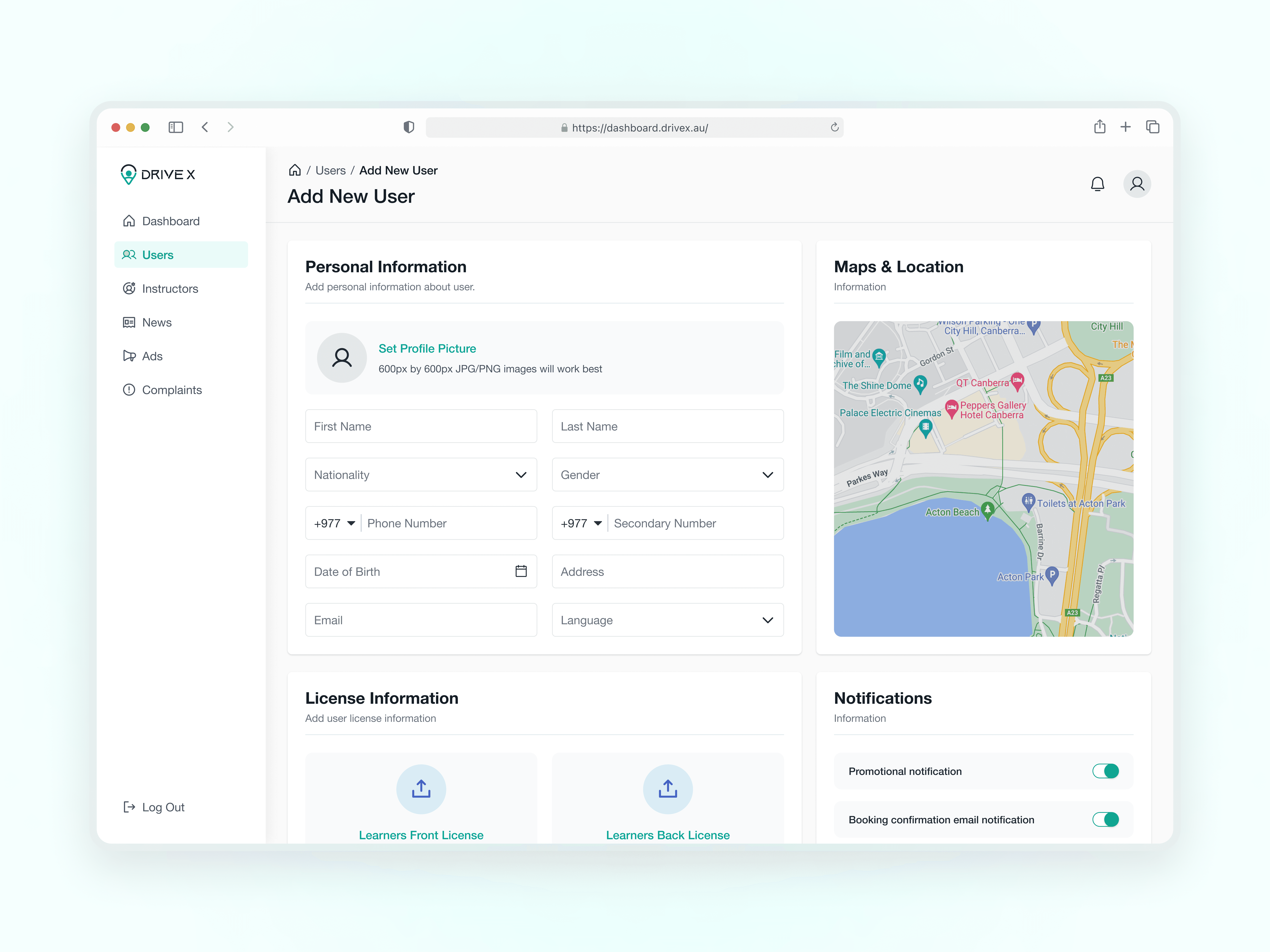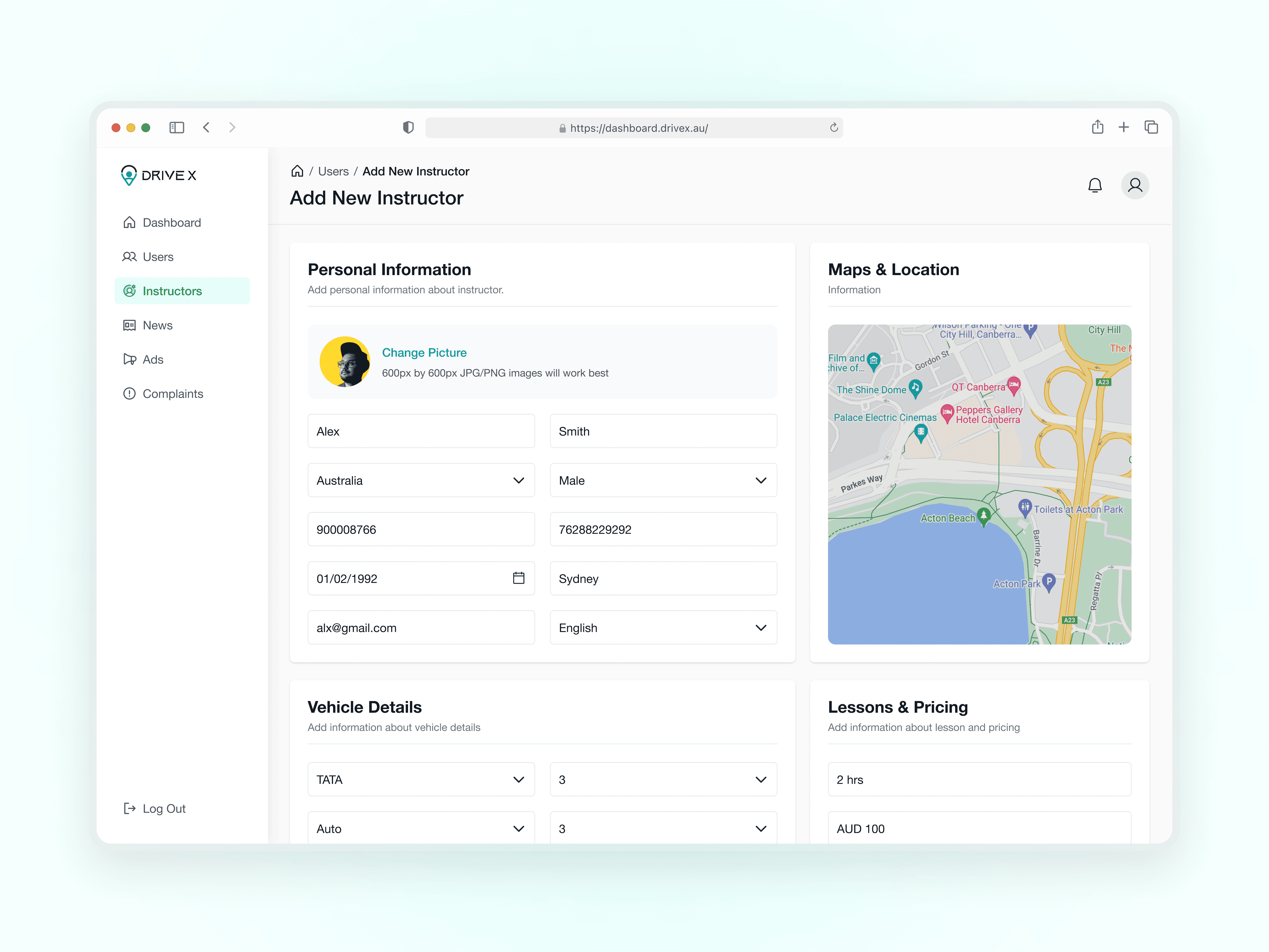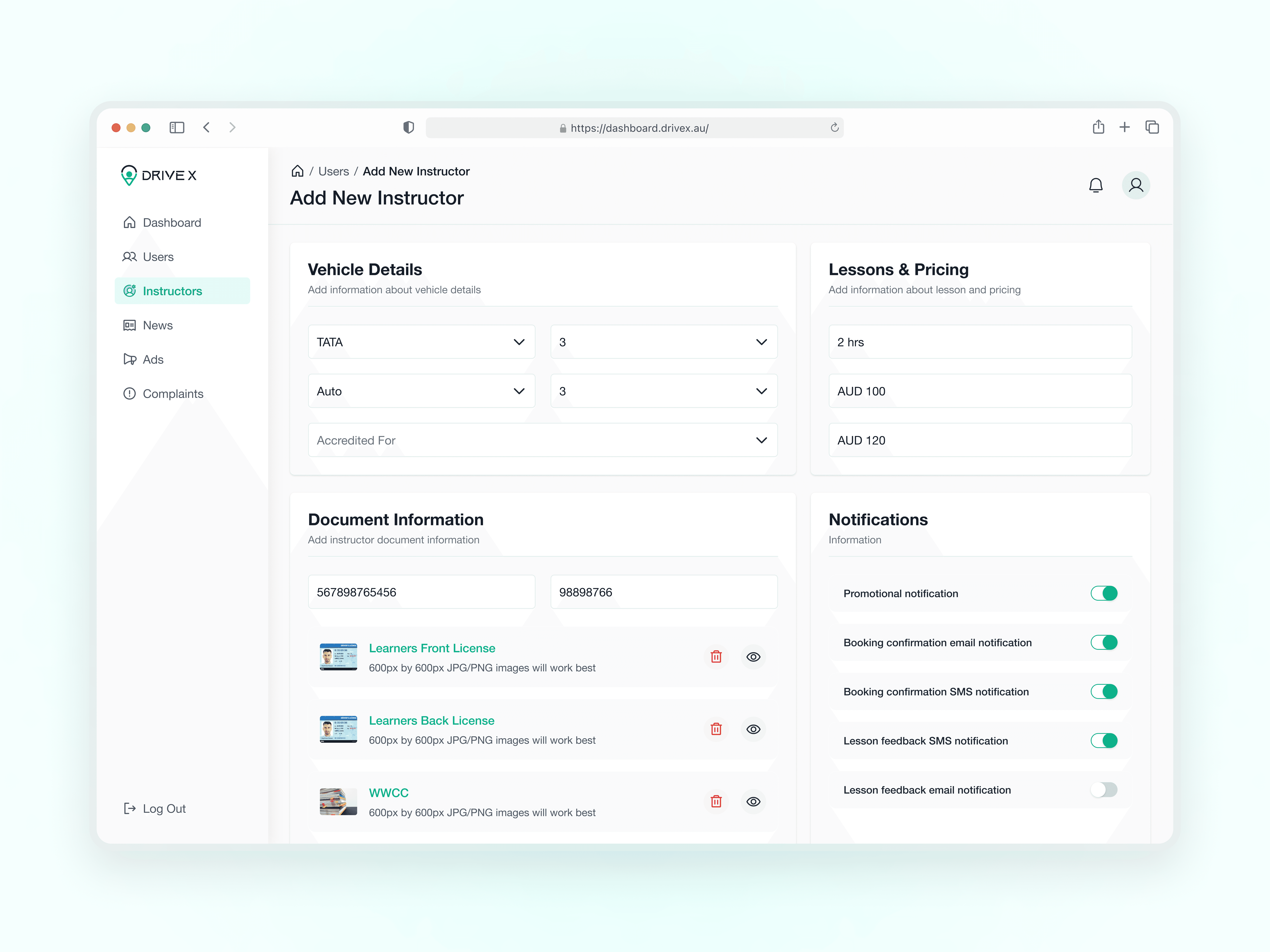 Ability to add new students and instructors. View and manage detailed user profiles, including: Instructor’s personal information, Vehicle details, Driving rates and Document information