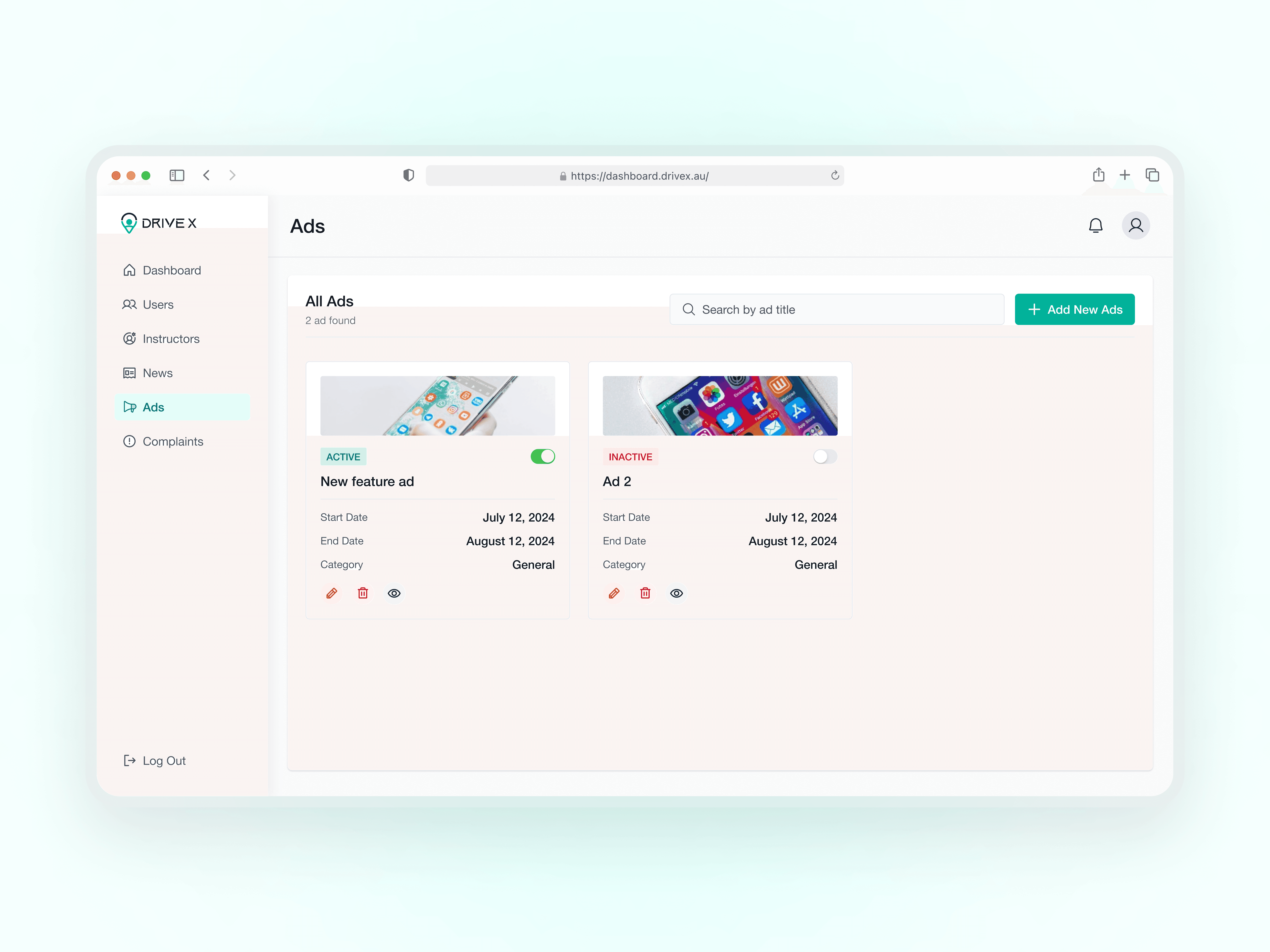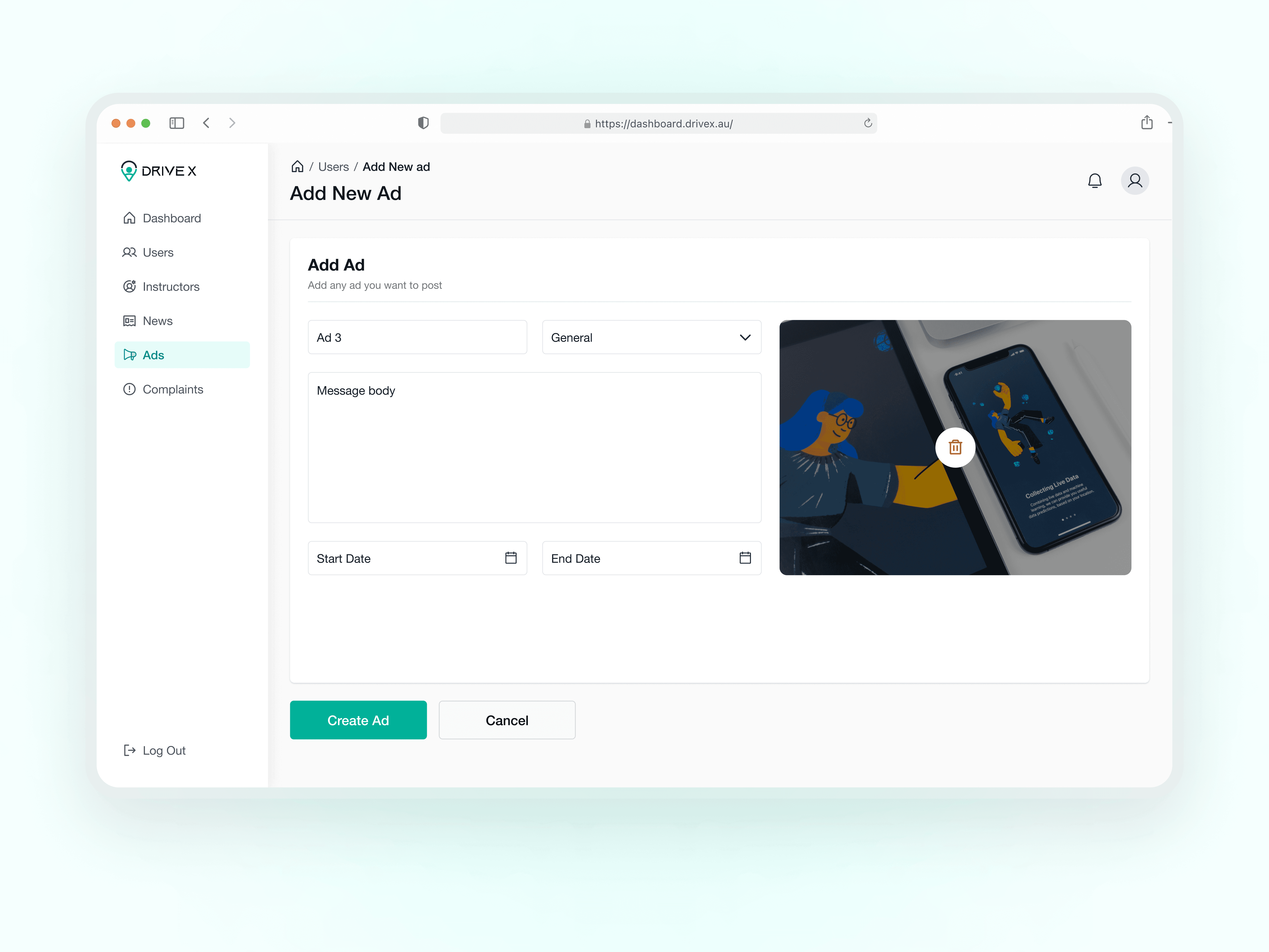With a growing user base of students and driving instructors, DriveX faced challenges in managing users effectively and gaining insights into their activity. Additionally, the platform lacked a dedicated tool for creating in-app advertisements, which limited its ability to promote new features and services. Our task was to design an admin system that addressed these pain points while ensuring a seamless user experience for administrators.