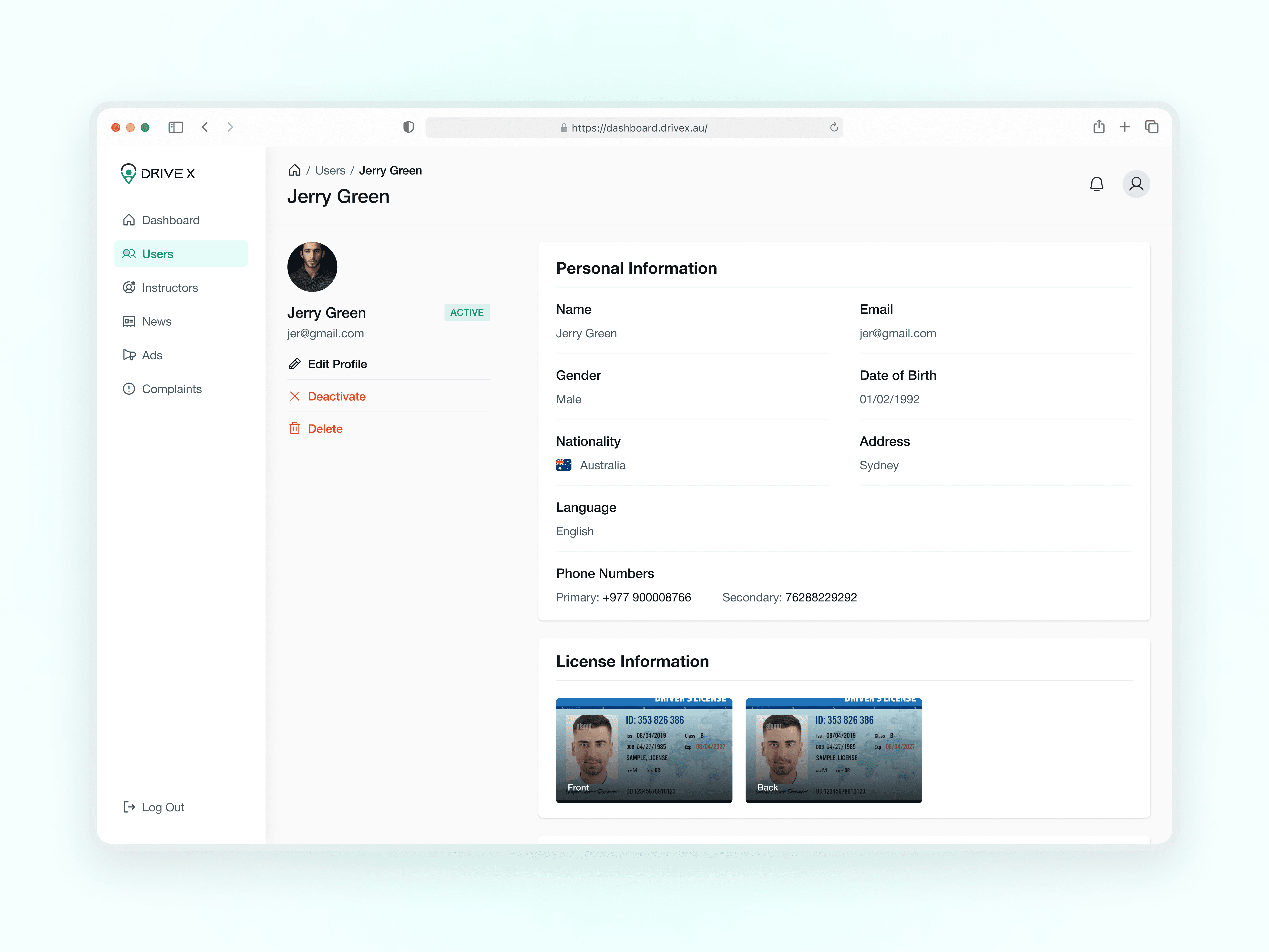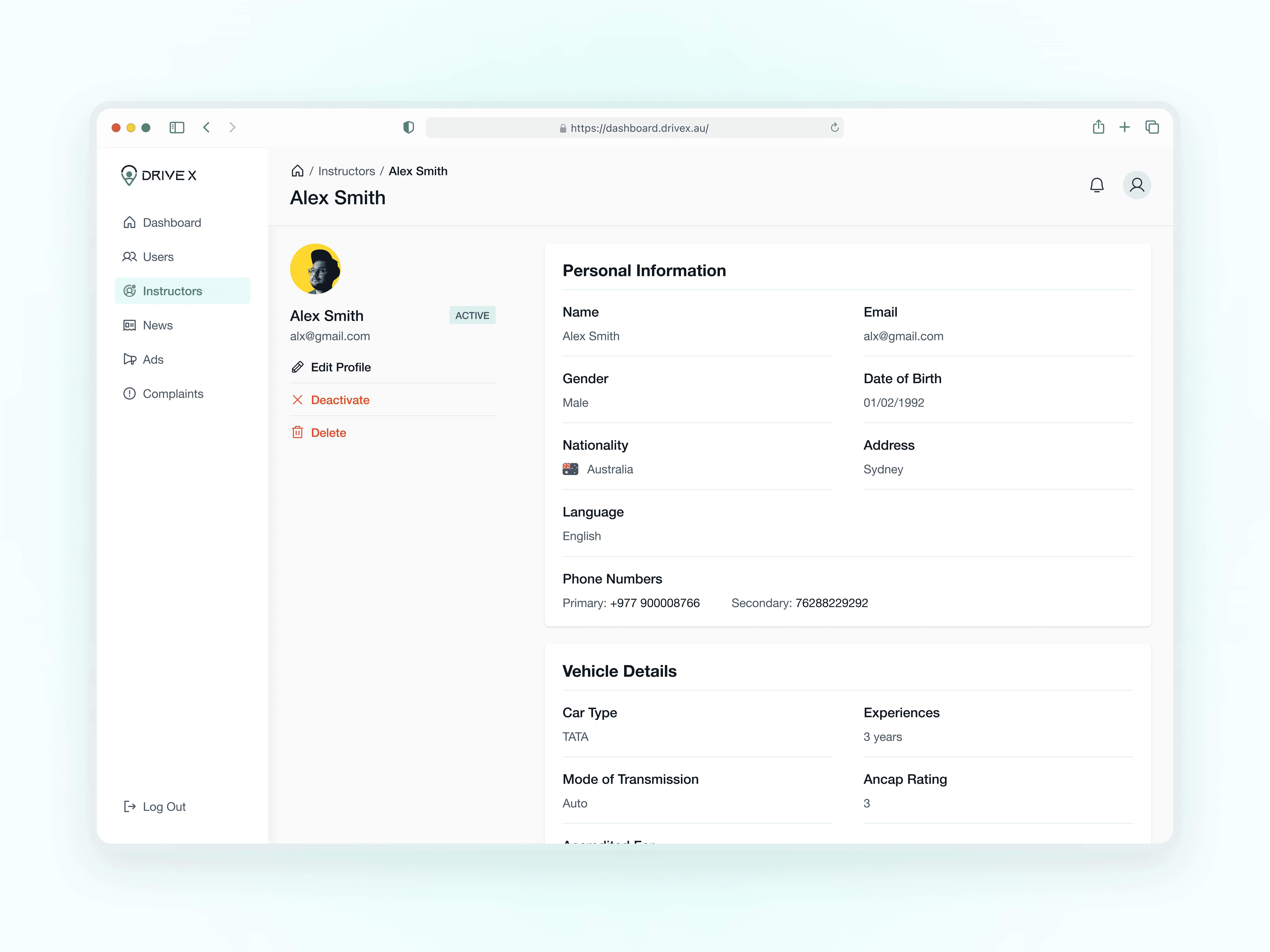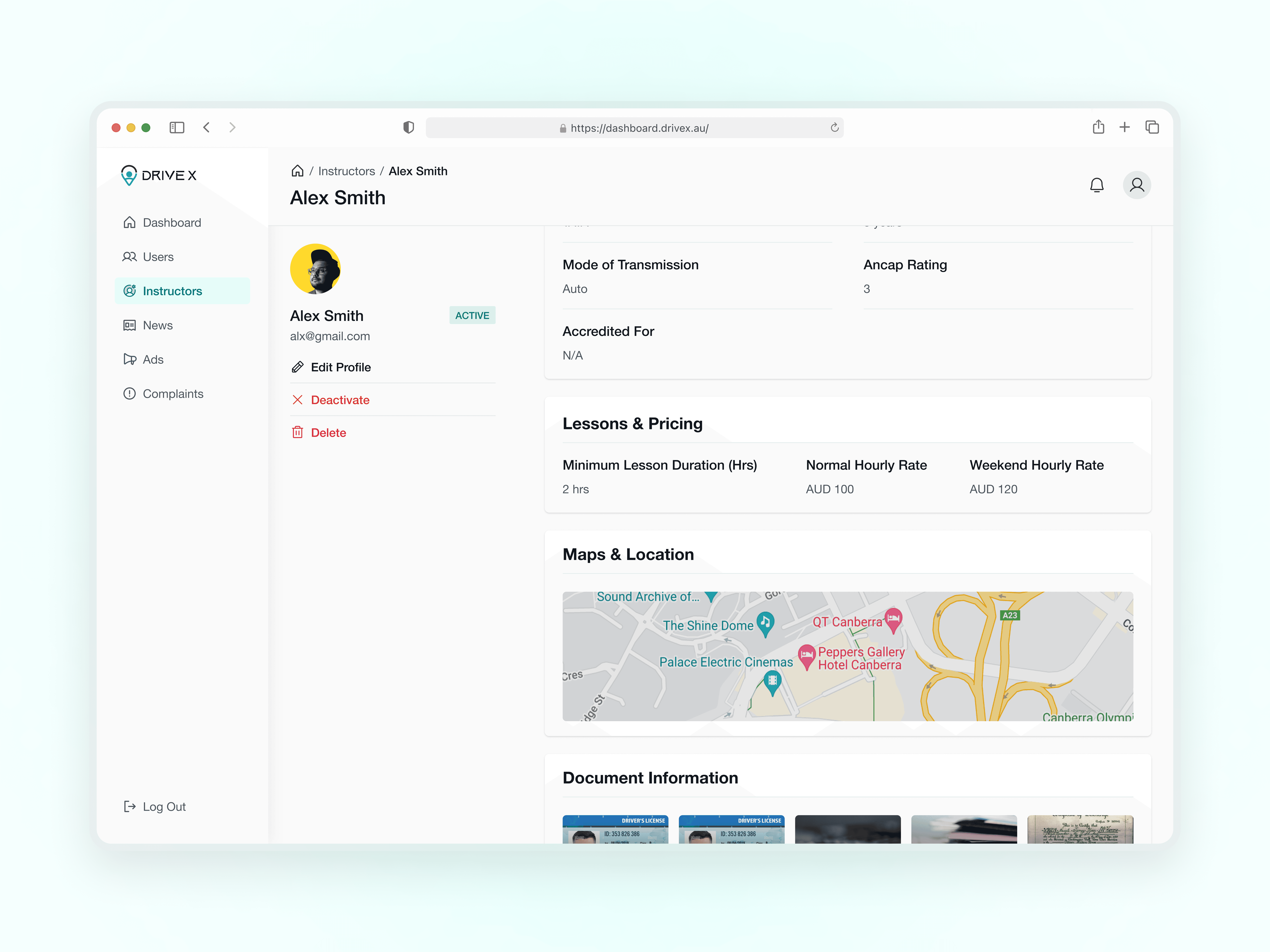 Admins required the ability to add students and instructors, as well as view detailed user profiles. For example, an instructor’s account includes personal information, vehicle details, driving rates, and document information.