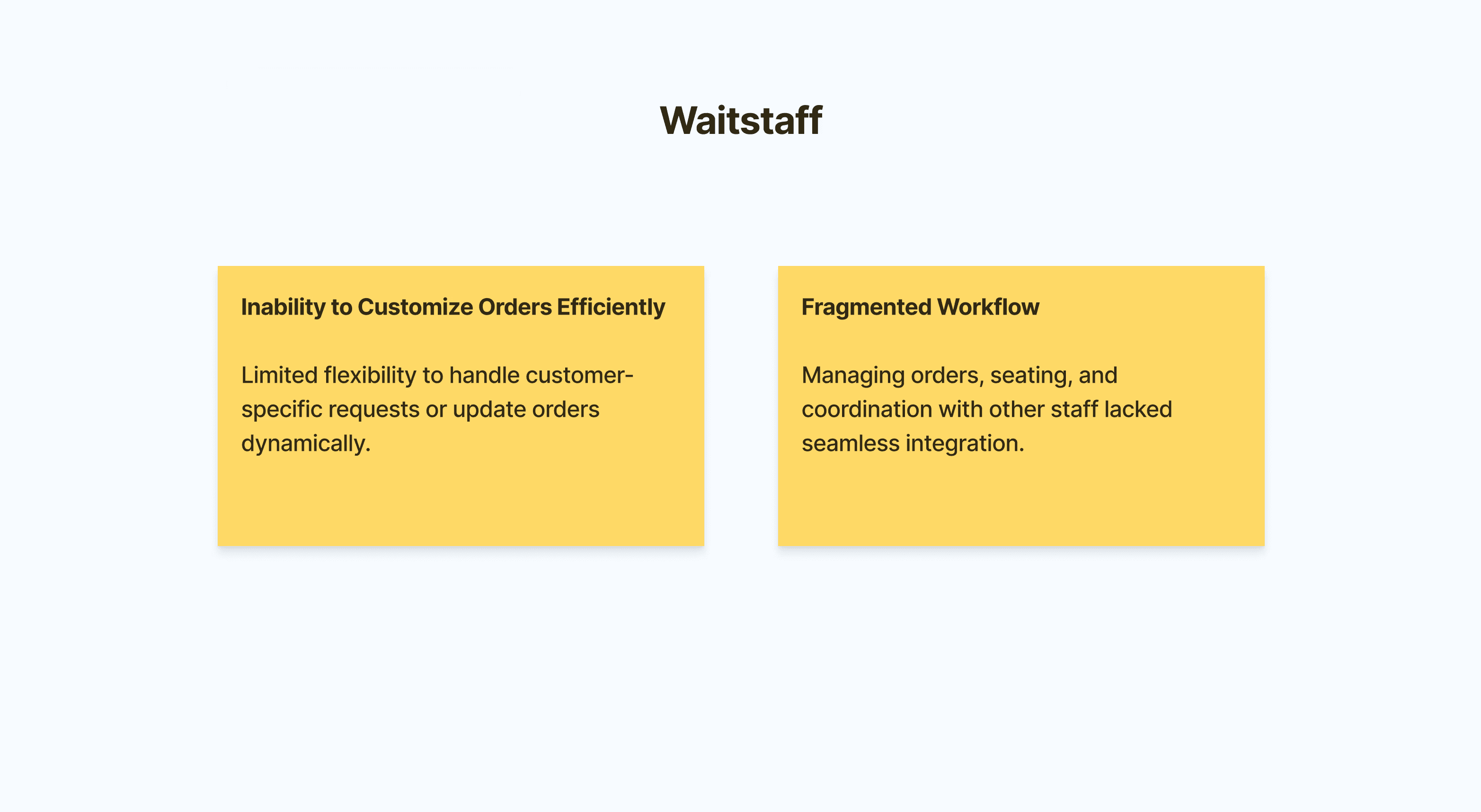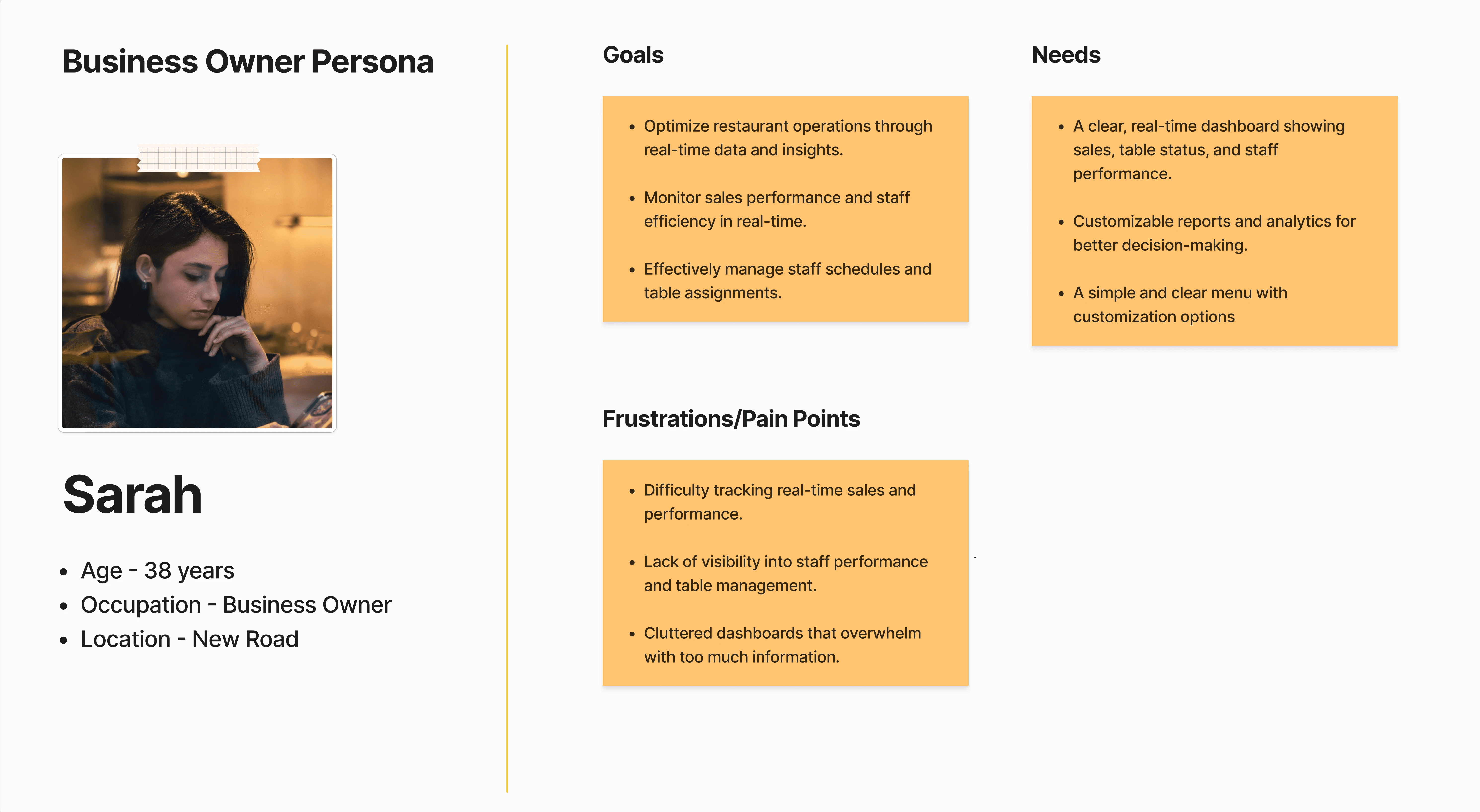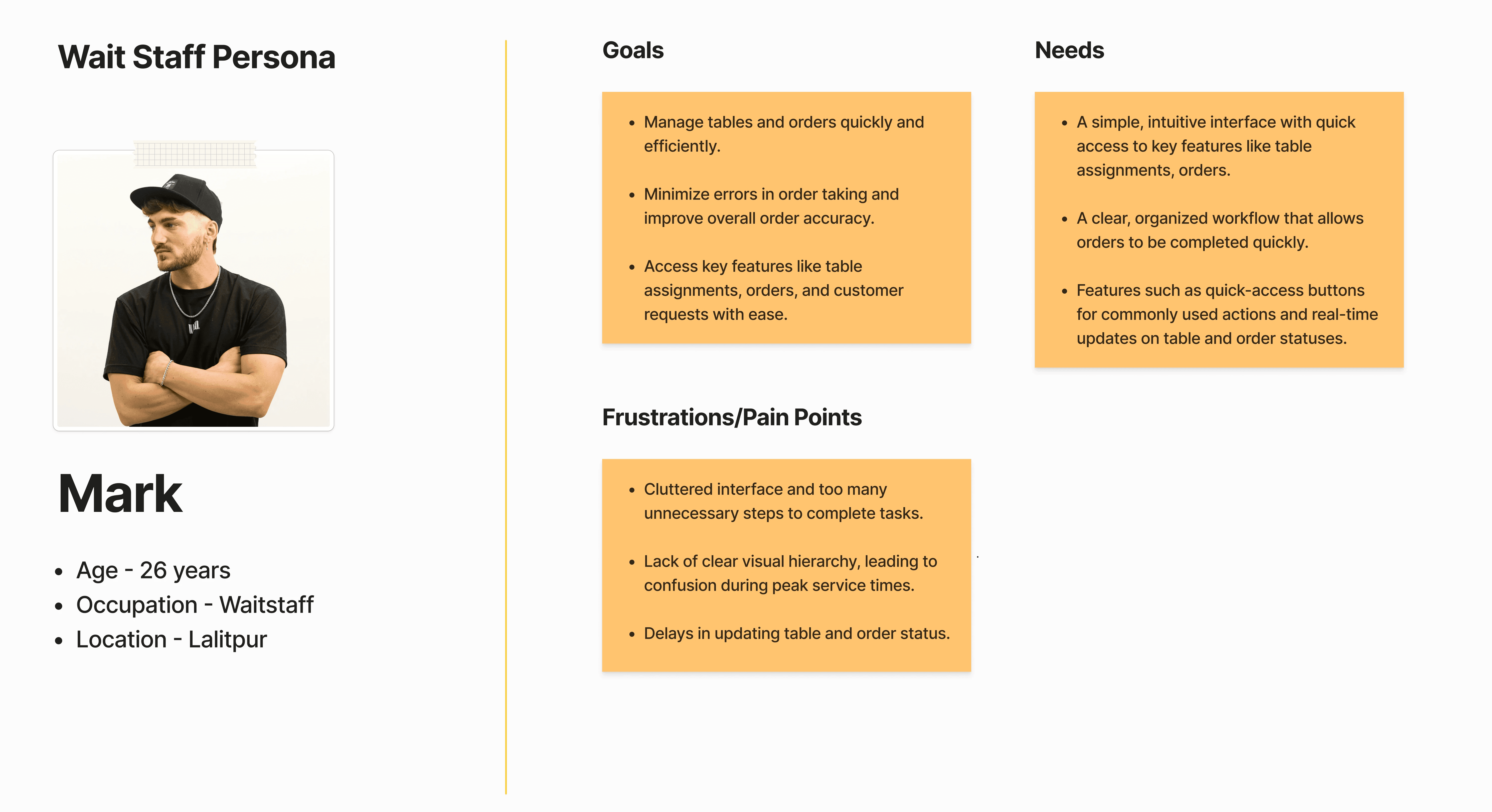 Based on the research, I created three primary personas: Owner/Manager, Waitstaff and Diner.