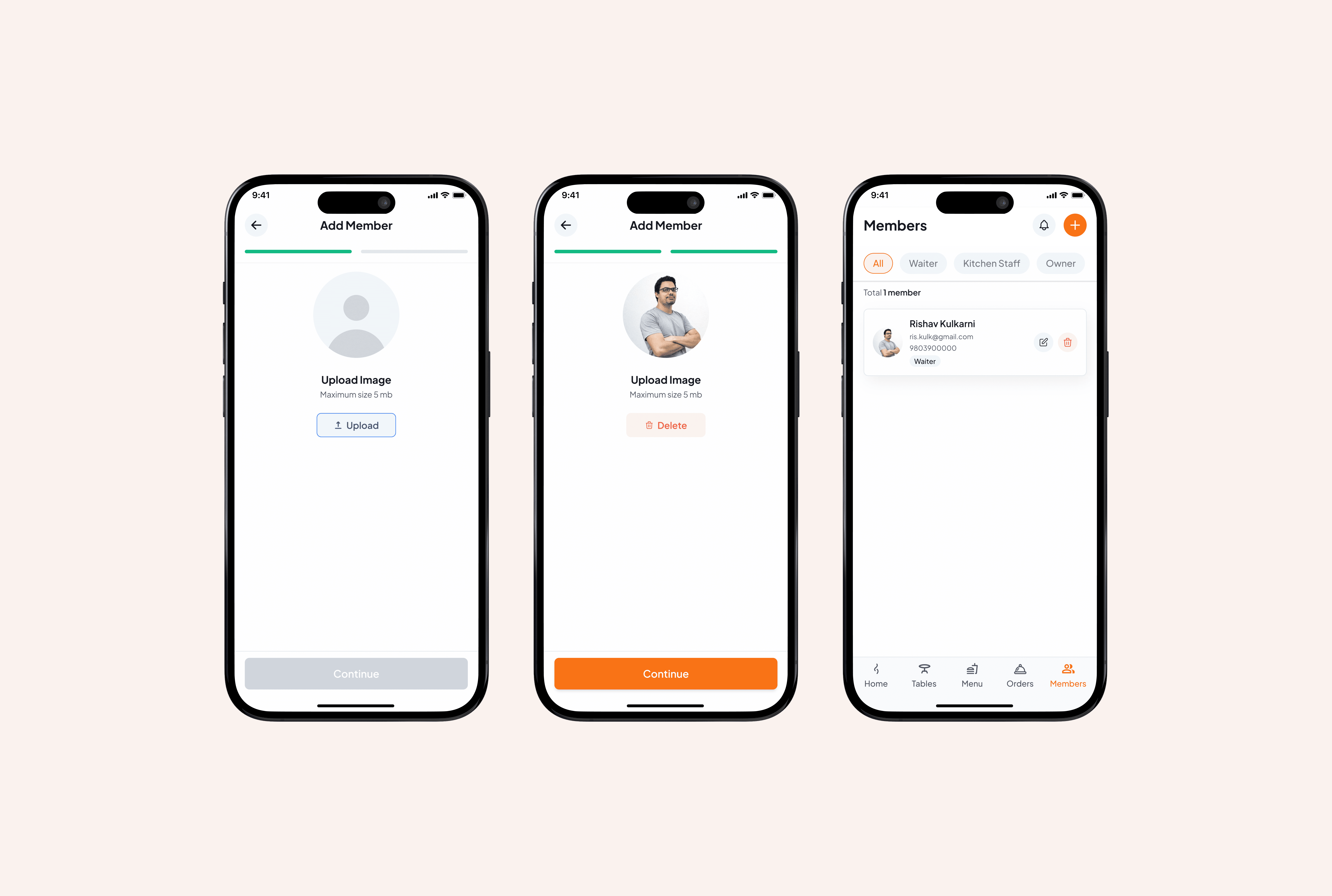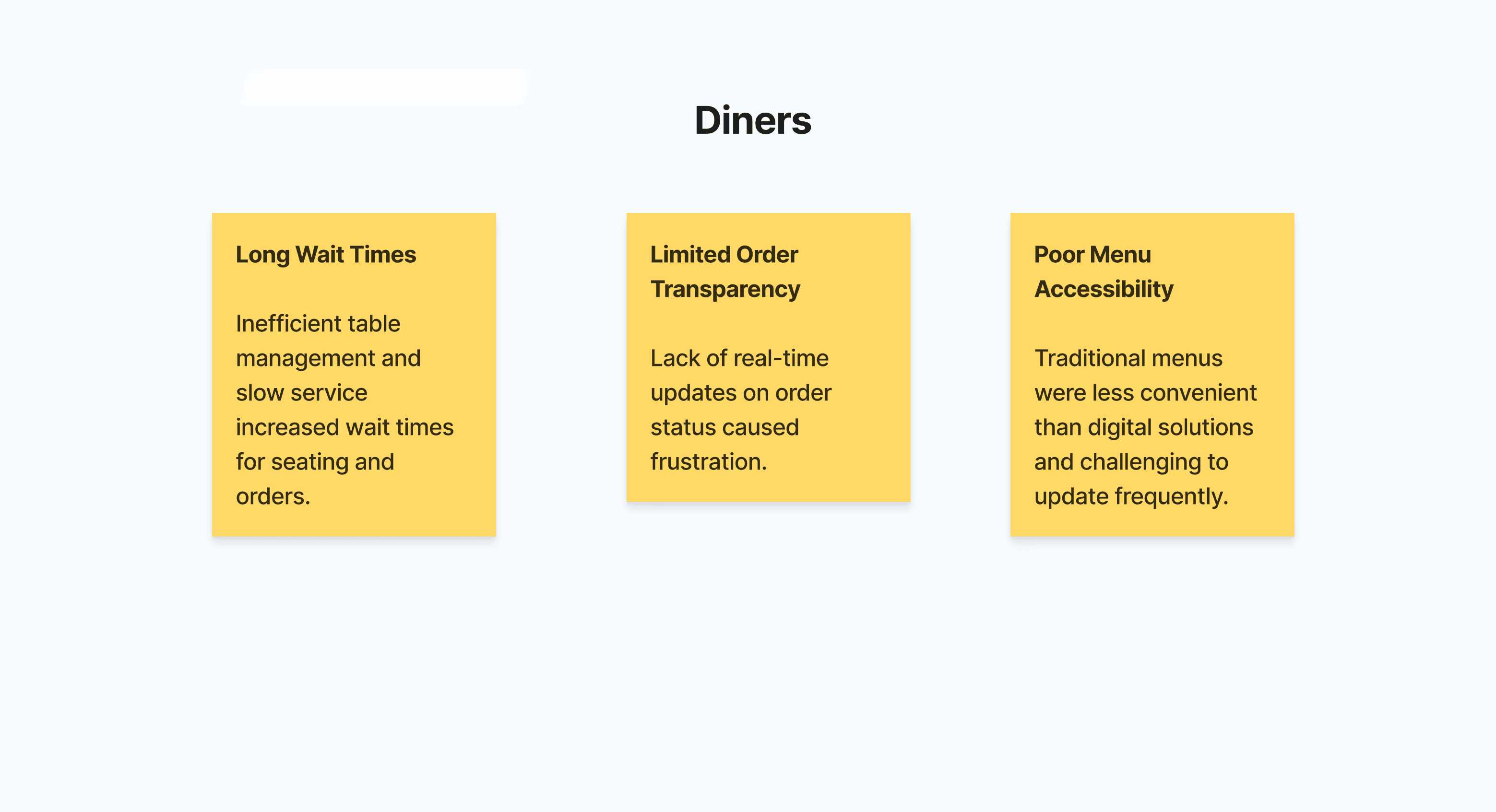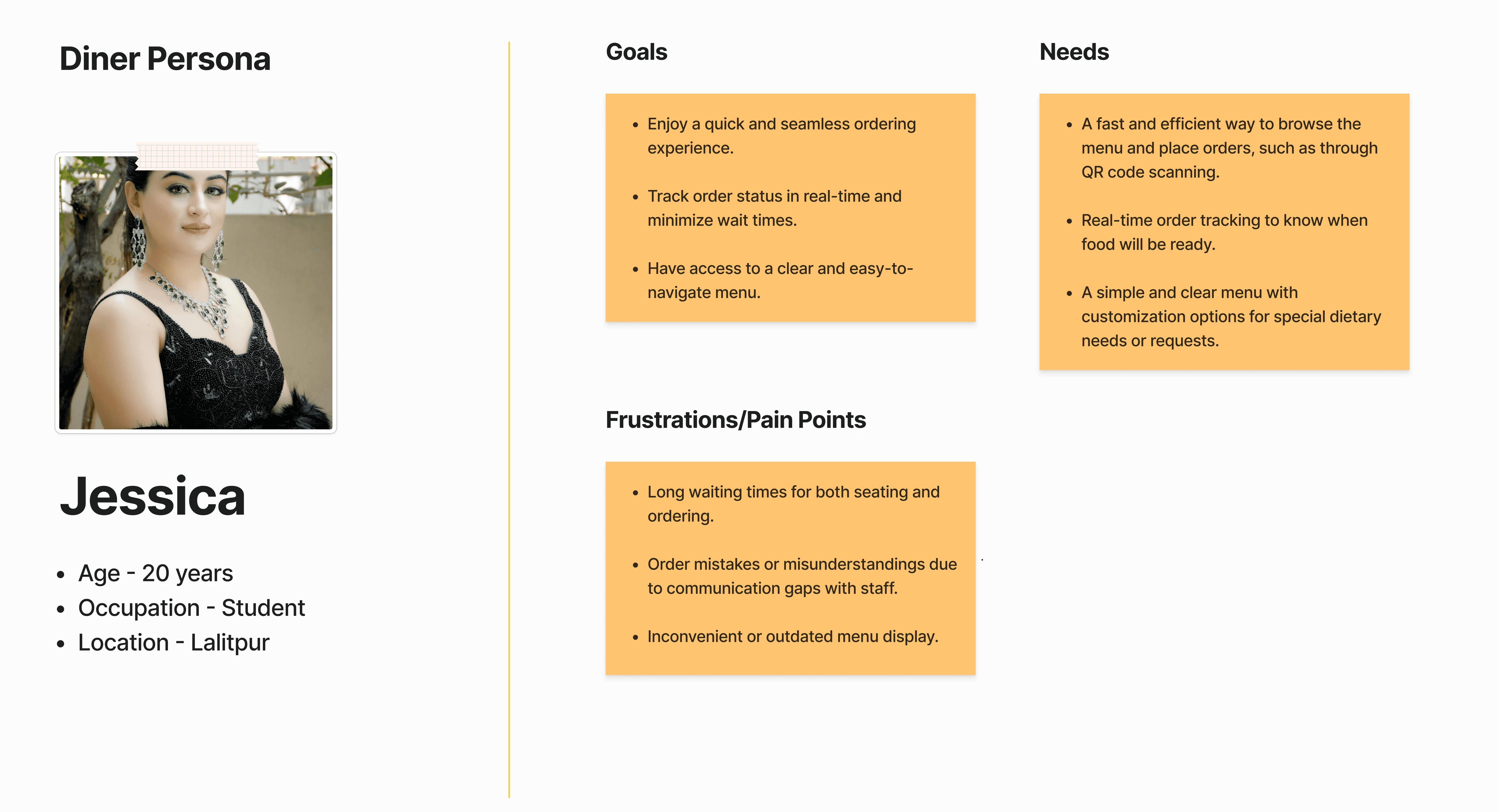 Based on the research, I created three primary personas: Owner/Manager, Waitstaff and Diner.