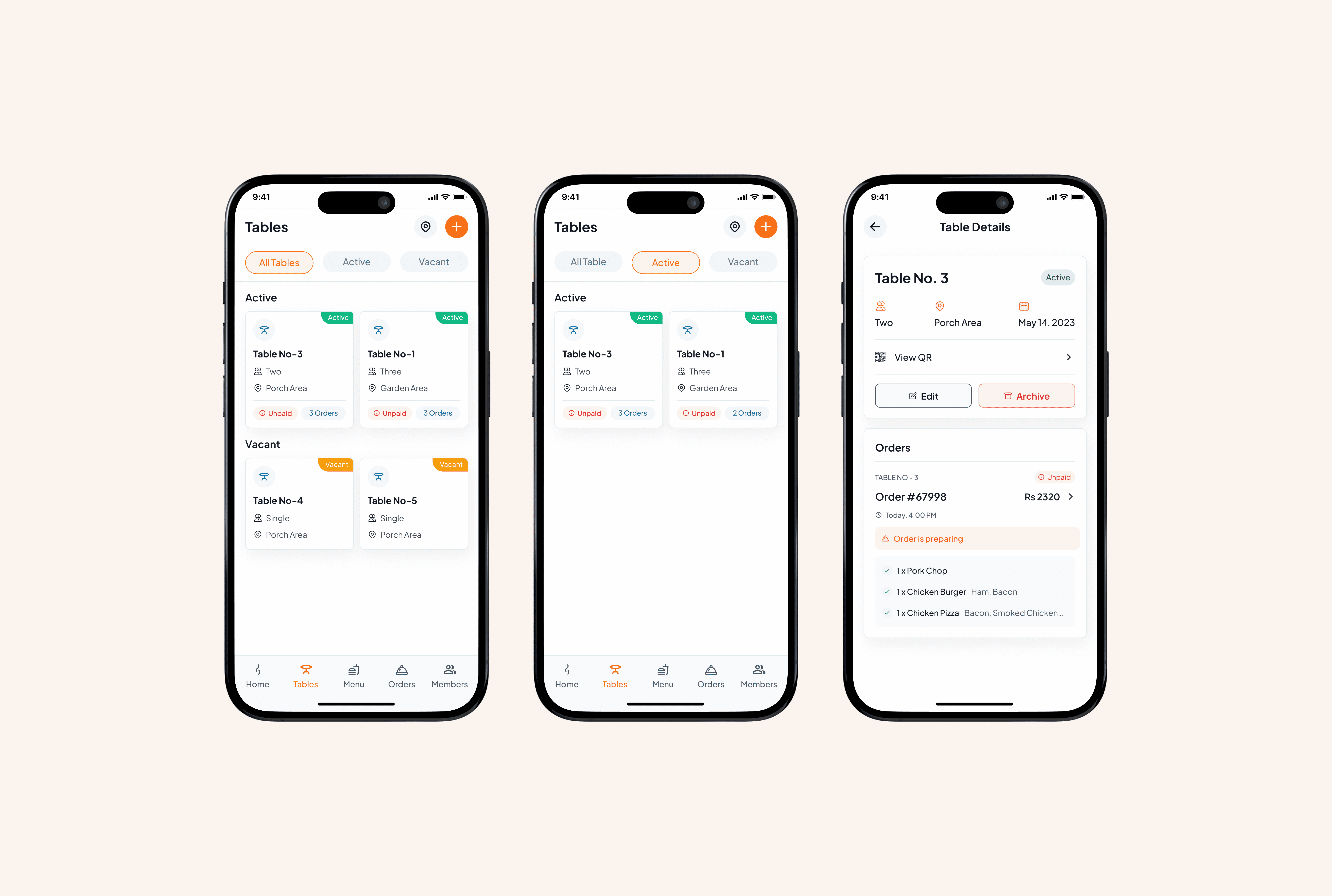 Simplifies the setup and management of table layouts for efficient seating. Enables QR code generation for diners to access menus and place orders directly from their table. Allows staff to view orders made by each table and navigate between active and vacant tables efficiently.